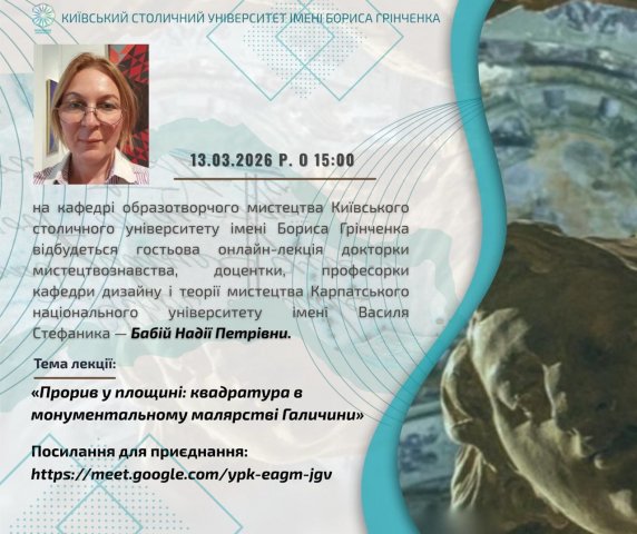 13 березня 2026 року на кафедрі образотворчого мистецтва Київського столичного університету імені Бориса Грінченка відбулася гостьова онлайн-лекція докторки мистецтвознавства, доцентки, професорки кафедри дизайну і теорії мистецтва Карпатського національного університету імені Василя Стефаника Надії Петрівни Бабій.