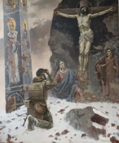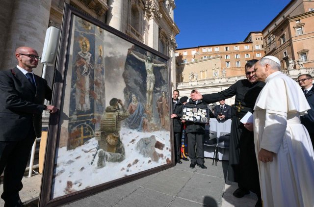 Друзі, сталася цікава подія! Наш старший викладач кафедри образотворчого мистецтва Наталія Полтавець презентувала 19 листопада в Ватикані картину українського художника Івана Волошина «Молитва» (2.50×2.10), в якій образно і метафорично розкрита тема російсько-української війни,яка є екзистенційною війною між добром і злом. На картині уклінний український воїн палко молиться в зруйнованій церкві перед образом розп’ятого Христа і Матінки Божої. Зворушливо написані і образи святих Миколая і Іоанна.
