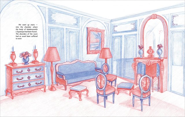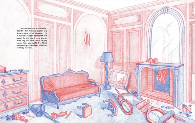 Студентка розробила проєкт видання англійською мовою. Уся книжка витримана в напруженій червоно-синій колірній палітрі. Ілюстрації із зображенням будівлі, інтер'єру, в якому відбувались події оповідання, цікаво задумані в просторі книги і виконані, згідно із сюжетною лінією літературного твору, з увагою до деталей та використанням можливостей техніки кольорового олівця. Авторка проєкту створила рукописні заголовки, форзац і всі каліграфічні елементи в книзі, характером написів вдало підкресливши атмосферу оповідання Едгара По.