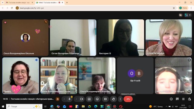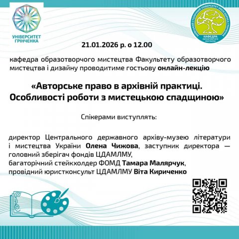 21 січня 2026 року кафедра образотворчого мистецтва Факультету образотворчого мистецтва і дизайну провела гостьову онлайн-лекцію на актуальну тему: «Авторське право в архівній практиці. Особливості роботи з мистецькою спадщиною».