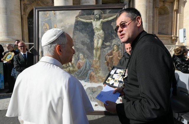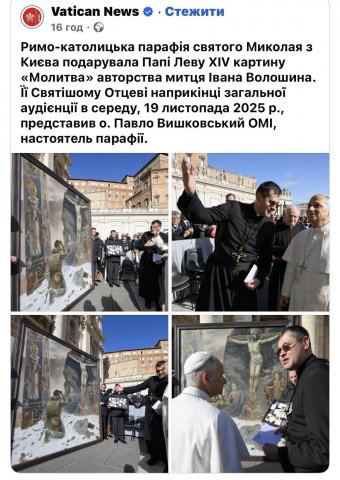 Друзі, сталася цікава подія! Наш старший викладач кафедри образотворчого мистецтва Наталія Полтавець презентувала 19 листопада в Ватикані картину українського художника Івана Волошина «Молитва» (2.50×2.10), в якій образно і метафорично розкрита тема російсько-української війни,яка є екзистенційною війною між добром і злом. На картині уклінний український воїн палко молиться в зруйнованій церкві перед образом розп’ятого Христа і Матінки Божої. Зворушливо написані і образи святих Миколая і Іоанна.